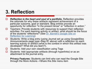 This document provides an overview of a workshop on using Web 2.0 tools as personal learning environments. It discusses theoretical concepts like lifelong and life-wide learning. It outlines some practical Web 2.0 tools like blogs, wikis, Google, YouTube, and Flickr. It also discusses introducing participants and having them work in teams. The document references a book on portfolios and learning. It provides examples of electronic portfolio components and frameworks. Finally, it discusses trends in ePortfolios like personalized learning, self-directed learning, and digital identity development.