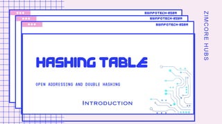 A hash table is a data structure that uses a hash function to map keys to unique indices in an underlying array. Collisions occur when two keys hash to the same index and must be resolved. Open addressing resolves collisions by probing through alternative array locations until an empty slot is found. Double hashing is an open addressing collision resolution technique that uses a secondary hash of the key as an offset when probing for the next index. Hash tables provide efficient lookup, insertion and deletion of key-value pairs and are used widely in applications like databases, caching and cryptography.