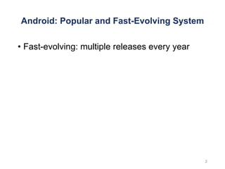 The document discusses the challenges posed by Android fragmentation, emphasizing the difficulty of ensuring app compatibility across diverse device models and operating system versions. It identifies common types of compatibility issues, their root causes, and includes a dataset of 27 popular apps to analyze compatibility fixes at the code level. The research highlights the importance of understanding these issues to improve developer practices and testing strategies.