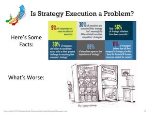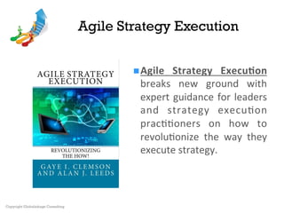 Agile Strategy Execution breaks new ground by providing expert guidance for leaders and practitioners on revolutionizing how they execute strategy. It presents an Agile Strategy Execution Framework that is aligned, accountable and responsive. This framework incorporates Agile concepts with best practices for strategy execution. It defines what organizations that execute strategy agilely look like, with values like continuous delivery of value, transparency, and valuing collaboration. The benefits of this framework include providing a taxonomy for measuring and communicating strategy execution processes in an open way.