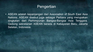 ASEAN didirikan pada tahun 1967 oleh lima negara Asia Tenggara untuk memperkuat kerjasama ekonomi, sosial, dan keamanan di kawasan tersebut. Organisasi ini kini terdiri atas 10 negara anggota dan bekerja untuk mewujudkan Masyarakat Ekonomi ASEAN melalui kerjasama yang luas di berbagai bidang.