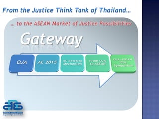 The document outlines various initiatives and platforms related to ASEAN's political, economic, and socio-cultural communities, focused on improving justice and legal cooperation. It highlights the importance of cross-cultural synergy and sharing best practices among ASEAN members. Additionally, it poses questions about preparedness, competency, and technical expertise for effective legal collaboration.