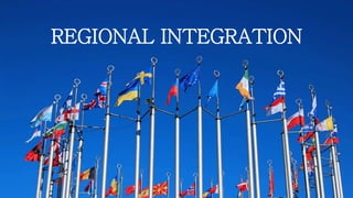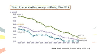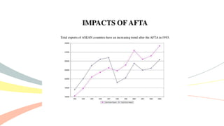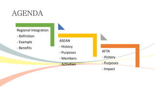 The document outlines the history and purposes of the ASEAN Free Trade Area (AFTA) and ASEAN's regional integration agenda, emphasizing cooperation among Southeast Asian nations to achieve economic growth and stability. It highlights the benefits of integration, such as increased trade and market size, as well as ASEAN's various agreements and collaborations with external partners. The document also discusses AFTA's goals of eliminating tariffs and attracting foreign direct investment while enhancing local manufacturing and supporting small businesses.