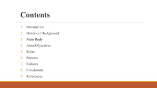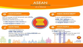 ASEAN was established in 1967 to promote economic growth, social progress, and cultural development among its members. It currently has 10 member states located in Southeast Asia. Key objectives include accelerating economic growth, promoting regional peace and stability, and providing assistance between members. ASEAN has been successful in maintaining regional peace and security, establishing frameworks for economic integration, and becoming an influential voice in global and regional affairs.