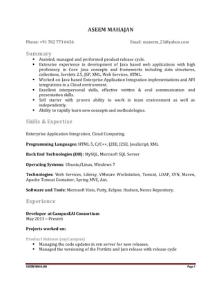 This document is a resume for Aseem Mahajan that outlines his skills and experience in developing Java web applications. It includes: