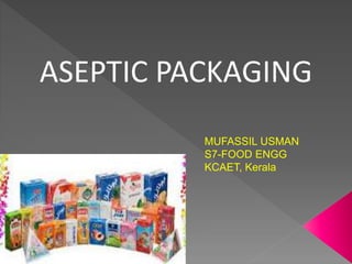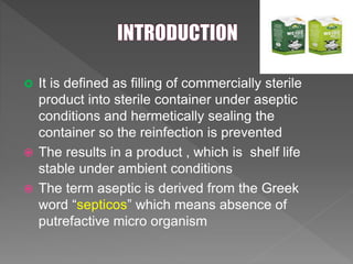 Aseptic packaging involves filling commercially sterile products into sterile containers and hermetically sealing them to prevent reinfection, resulting in shelf-stable products. The process includes sterilizing the product and packaging materials before filling, often utilizing heat, chemicals, or radiation for sterilization. Aseptic packaging offers advantages such as no refrigeration requirements, long shelf life, and enhanced nutrition but presents challenges like high installation costs and potential flavor issues.