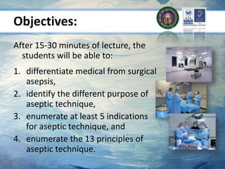 3. The document lists five indications for aseptic technique, including suturing wounds, inserting catheters or tubes, and caring for surgical wounds. It also outlines 13 principles of aseptic technique focused on maintaining sterility.