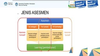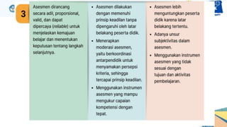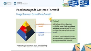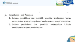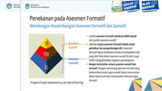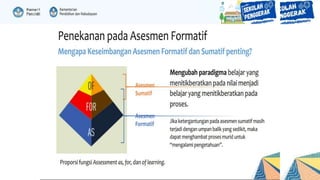 Paradigma baru dalam asesmen kurikulum merdeka mencakup asesmen formatif, sumatif, dan diagnostik. Asesmen diagnostik bertujuan mengetahui kondisi awal siswa, baik non-kognitif maupun kognitif. Hasil asesmen digunakan untuk menyesuaikan pembelajaran, misalnya memberikan remedial bagi siswa yang kompetensinya di bawah rata-rata.
