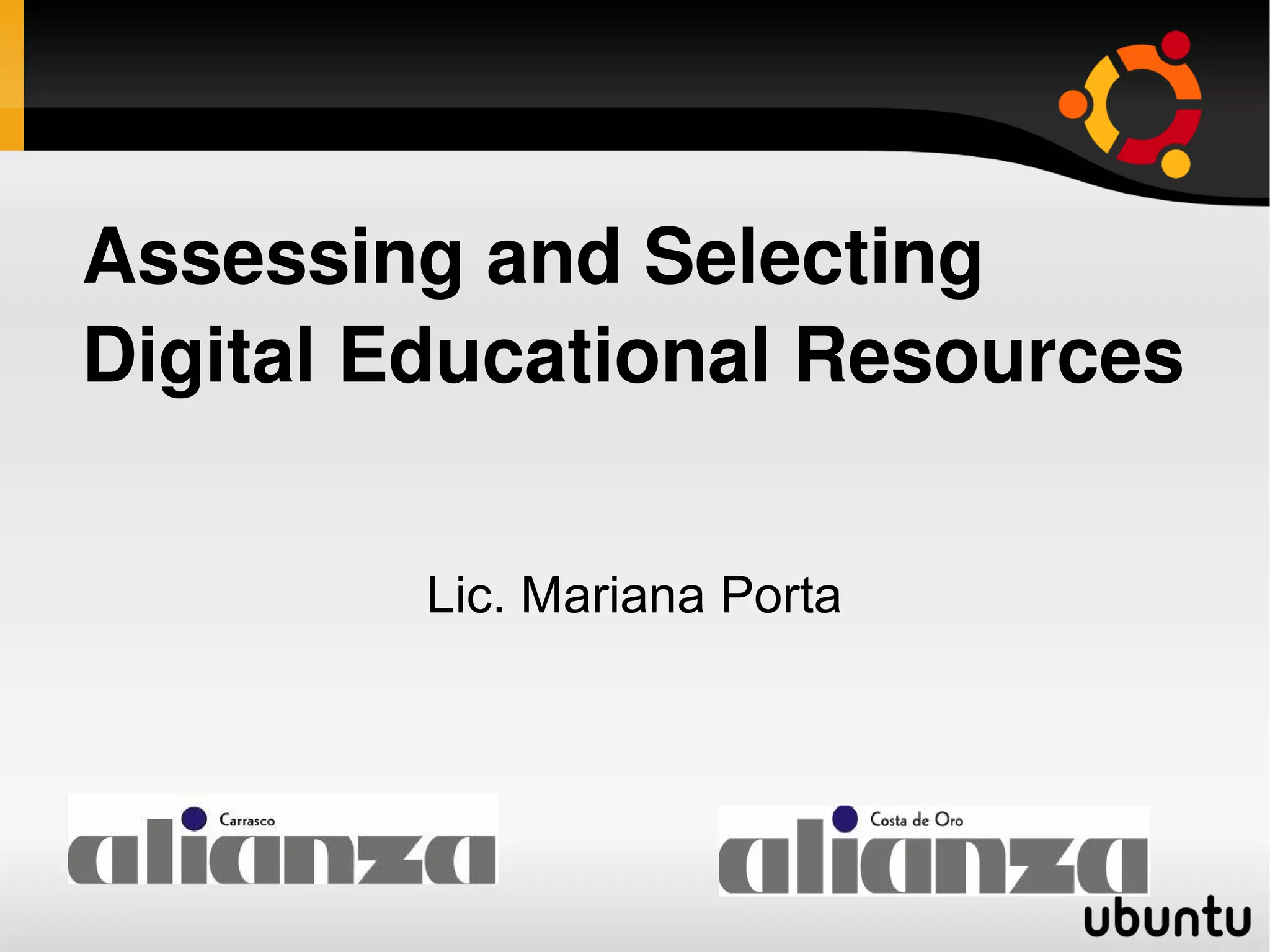 This document provides a framework for evaluating digital educational resources. It outlines six dimensions to consider: (1) context of implementation, (2) technical, (3) pedagogical, (4) interactivity, (5) design, and (6) ideological. Key criteria include the learning theory behind the resource, role of the teacher, evaluation methods, and accessibility. A seven-step process is proposed: (1) design course, (2) survey options, (3) evaluate, (4) choose, (5) implementation plan, (6) train staff, (7) implement and evaluate. Examples of digital resources like FOG Interactive and MyELT are provided. The conclusion stresses the importance of