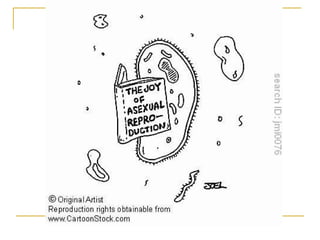 Asexual reproduction allows for reproduction with only one parent where the offspring are genetically identical clones of the parent. There are several types of asexual reproduction including binary fission in single-celled organisms, budding in hydra and yeast where one cell remains attached, and vegetative propagation where new plants grow from roots or stems of the parent plant.