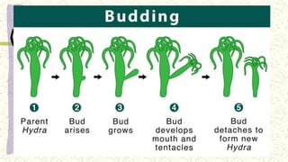 This document discusses and compares asexual and sexual reproduction. It defines asexual reproduction as reproduction involving only one parent that produces offspring identical to itself. Methods of asexual reproduction include vegetative reproduction, binary fission, budding, spore formation, and regeneration. Sexual reproduction involves the merging of genetic material from two parents to produce offspring with a combination of both parents' genes. Methods of sexual reproduction discussed include conjugation, pollination, and fertilization. The document aims to differentiate asexual and sexual reproduction in terms of the number of individuals involved and the genetic similarities between parents and offspring.