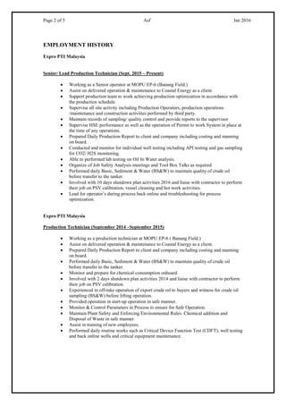 This resume is for Aizul Shah Fairuz Bin Shamsudin, who is currently a Senior/Lead Production Technician at Expro PTI Malaysia. He has over 8 years of experience in production operations and maintenance for offshore platforms and FPSOs. He holds qualifications in mechanical engineering and process control. His skills include mechanical and maintenance work, process and technical support, and computer proficiency. He is enthusiastic, safety-conscious, and able to work well independently or as part of a team.