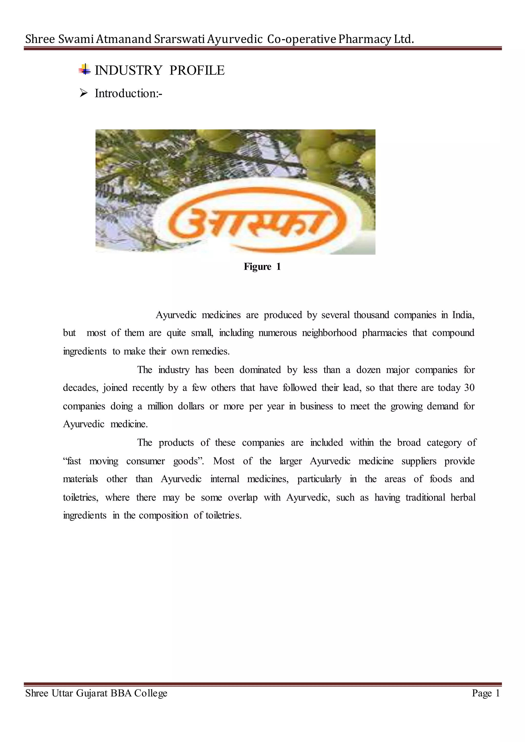 The document provides an overview of the Ayurvedic medicine industry in India. It discusses that the industry is made up of thousands of small companies and neighborhood pharmacies as well as less than a dozen major companies that dominate the market. It notes that Ayurvedic medicines are considered fast moving consumer goods. The document also provides background on Ayurvedic medicine practices and principles. It analyzes the market size and growth of the pharmaceutical industry in India, including its exports and position as a global leader in generic drugs. SWOT analysis identifies strengths such as agricultural and expertise resources, and weaknesses like lack of awareness and support.