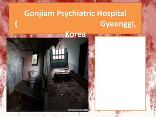 This document lists several abandoned or lesser known locations around the world that have dark histories or paranormal associations, including Gonjiam Psychiatric Hospital in Korea, Battleship Island in Japan, Teshuilo Lake in Mexico known for the legend of Don Julian Santana, the Akodessewa Fetish Market in Togo's capital Lomé, Japan's Aokigahara Forest at the base of Mount Fuji known for suicides, the Sedlec Ossuary in the Czech Republic decorated with human bones, the abandoned amusement park in Pripyat near the Chernobyl nuclear disaster site, and travel companies that offer tours to these locations like Lupine Travel and Ukraine-based Solo East Travel