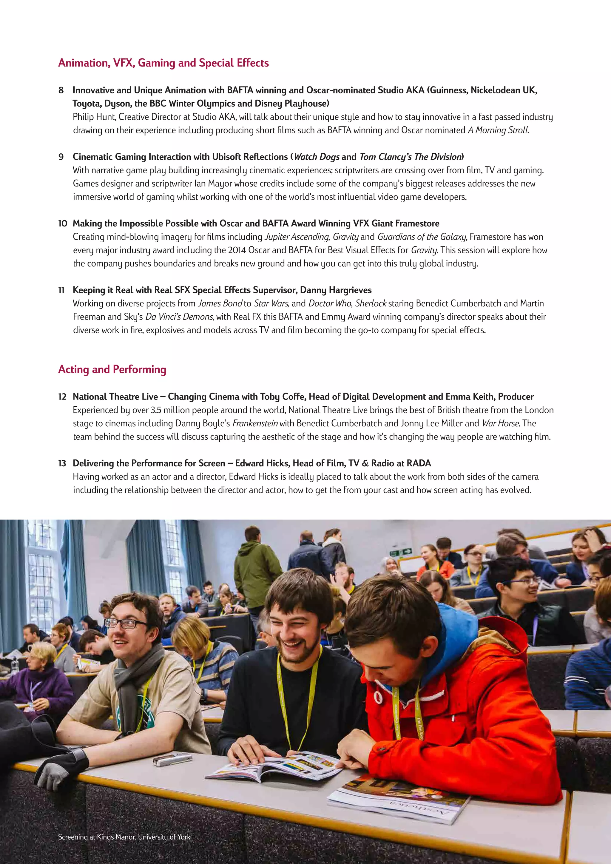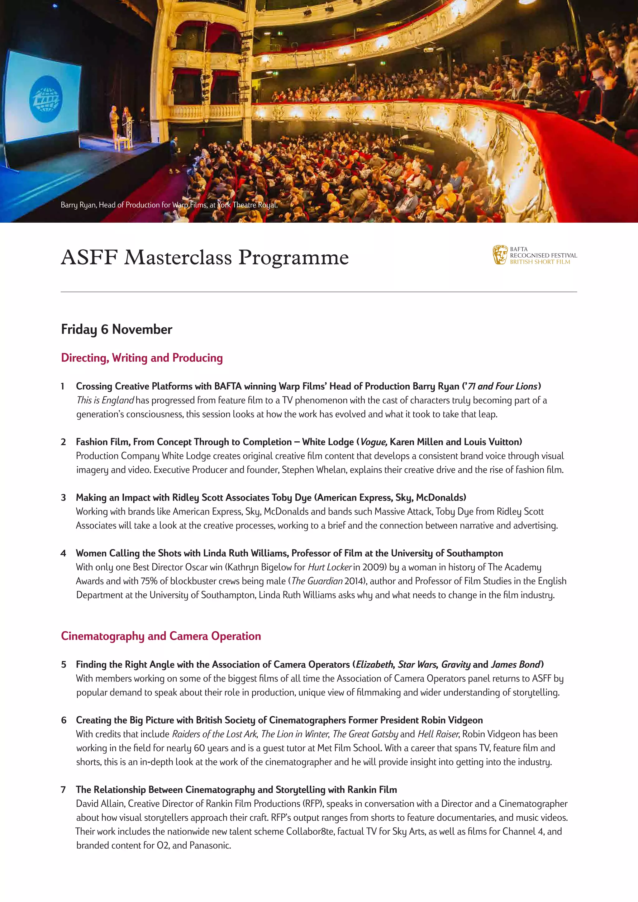 This document provides an overview of the ASFF Masterclass Programme taking place on November 6-7. It outlines 23 masterclasses on various filmmaking topics such as directing, writing, producing, cinematography, VFX, animation, acting, editing, distribution and more. Highlights include masterclasses from BAFTA winning Warp Films, VFX company Framestore, Ridley Scott Associates, National Theatre Live and Channel 4. The masterclasses will feature industry professionals providing insights and advice related to their areas of expertise.