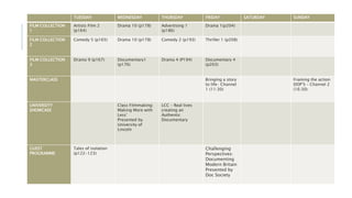 This document provides a schedule of films, TV programs, and events for a week. It includes films from different genres such as drama, comedy, documentary, and thriller. Featured films discuss topics like families, isolation, immigration, and more. The document also lists masterclasses on filmmaking techniques and university showcases of student films. Descriptions of several short films are provided with notes on elements like cinematography, editing, storytelling, and how they relate to the reviewer's planned film project.