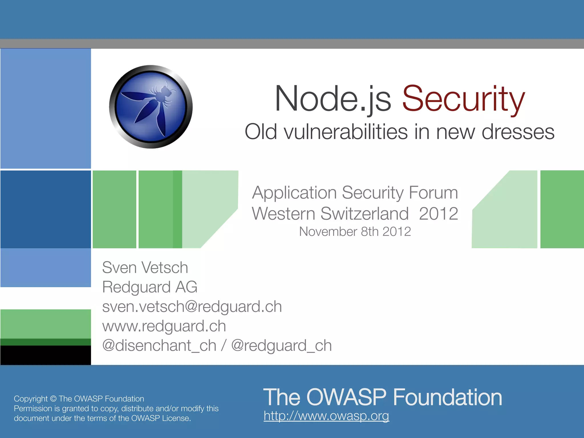 The document discusses security issues related to Node.js applications. It begins by providing an overview of Node.js and how it allows JavaScript to be executed server-side. It then discusses how well-known vulnerabilities like cross-site scripting (XSS), code injection, and remote code execution can occur in Node.js applications if developers are not careful. Specific examples are provided around evaluation of untrusted JSON, uncontrolled use of the eval() function, and crashing servers by causing unhandled exceptions. The document concludes by noting that many common features are not supported out of the box in Node.js and must be added through external modules.