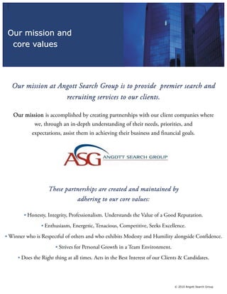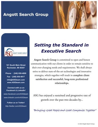 Angott Search Group is an executive search firm located in Rochester, Michigan that has been in business since 1981. The firm is committed to open communication with clients to understand their needs and deliver innovative strategies and technologies to achieve client satisfaction and long-term relationships. Angott Search Group has experienced sustained growth over the past two decades by partnering with clients to help them achieve their business goals through executive search services. The firm provides search services on a retained, contingency, or contract basis across various industries.
