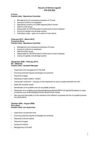 This resume is for Ashman Jagnaik, providing his personal details and work history. He has over 15 years of experience in operations management and supervision roles. His most recent role is Operations Manager at KZN Business Solutions where he oversees multiple sites and ensures high service levels. He has qualifications in operations training, first aid, health and safety, and supervision. References are provided.