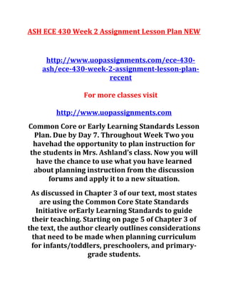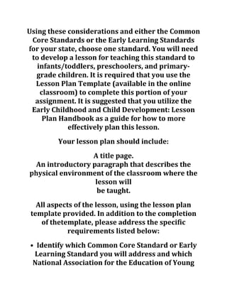 The document outlines an assignment for ECE 430 requiring students to create a lesson plan based on common core or early learning standards. Students must develop a detailed lesson for different age groups, using a specific template and addressing differentiation for infants, toddlers, preschoolers, and primary-grade children. Additionally, the assignment should include a closing paragraph reflecting on curriculum planning considerations and requires scholarly sources to support the content.