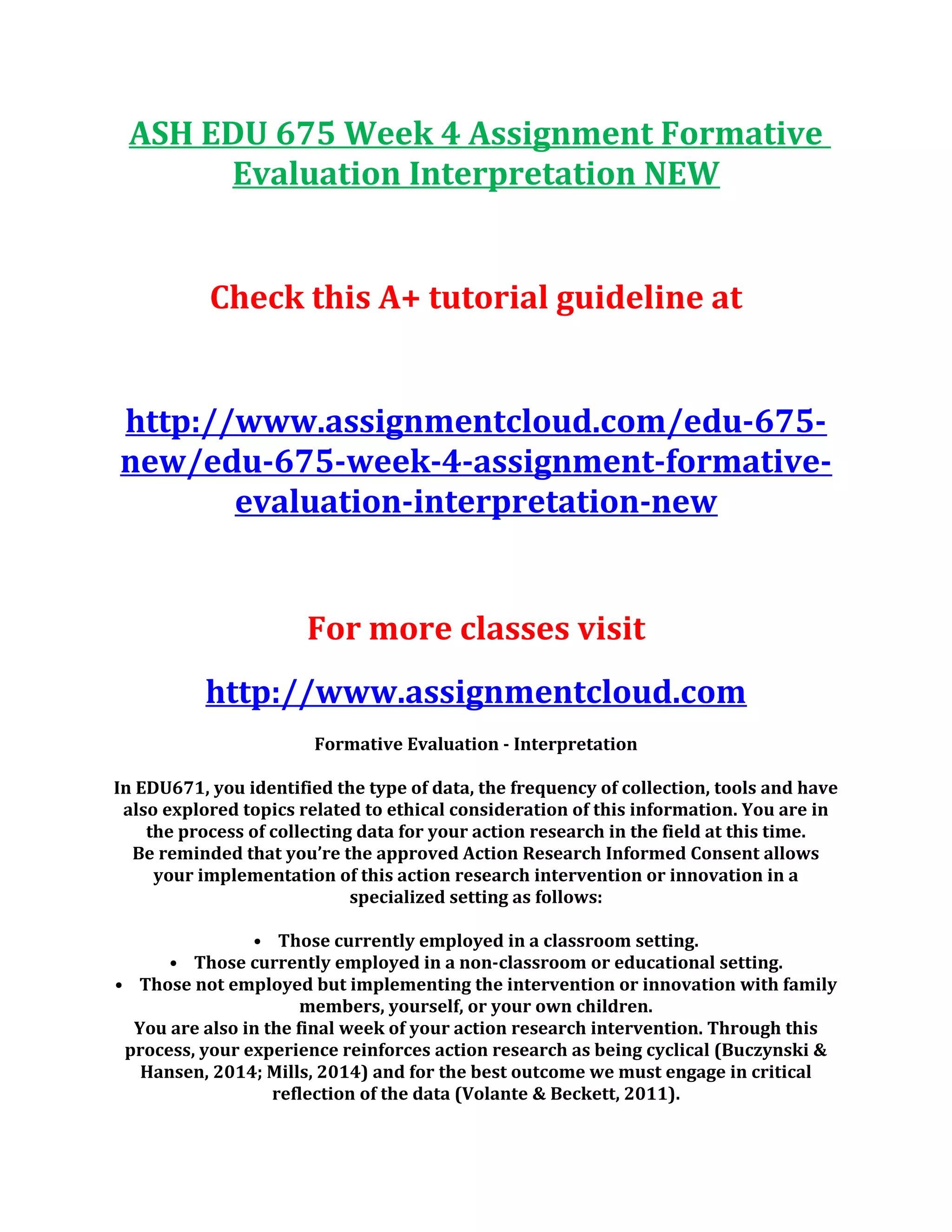 The document outlines the expectations for a formative evaluation and data analysis assignment in an action research context. It emphasizes the importance of reflecting on emerging themes from collected data, aligning them with research questions, and considering personal experiences relating to findings. Additionally, it provides specific content and written communication requirements to ensure comprehensive and clear presentation of the analysis.