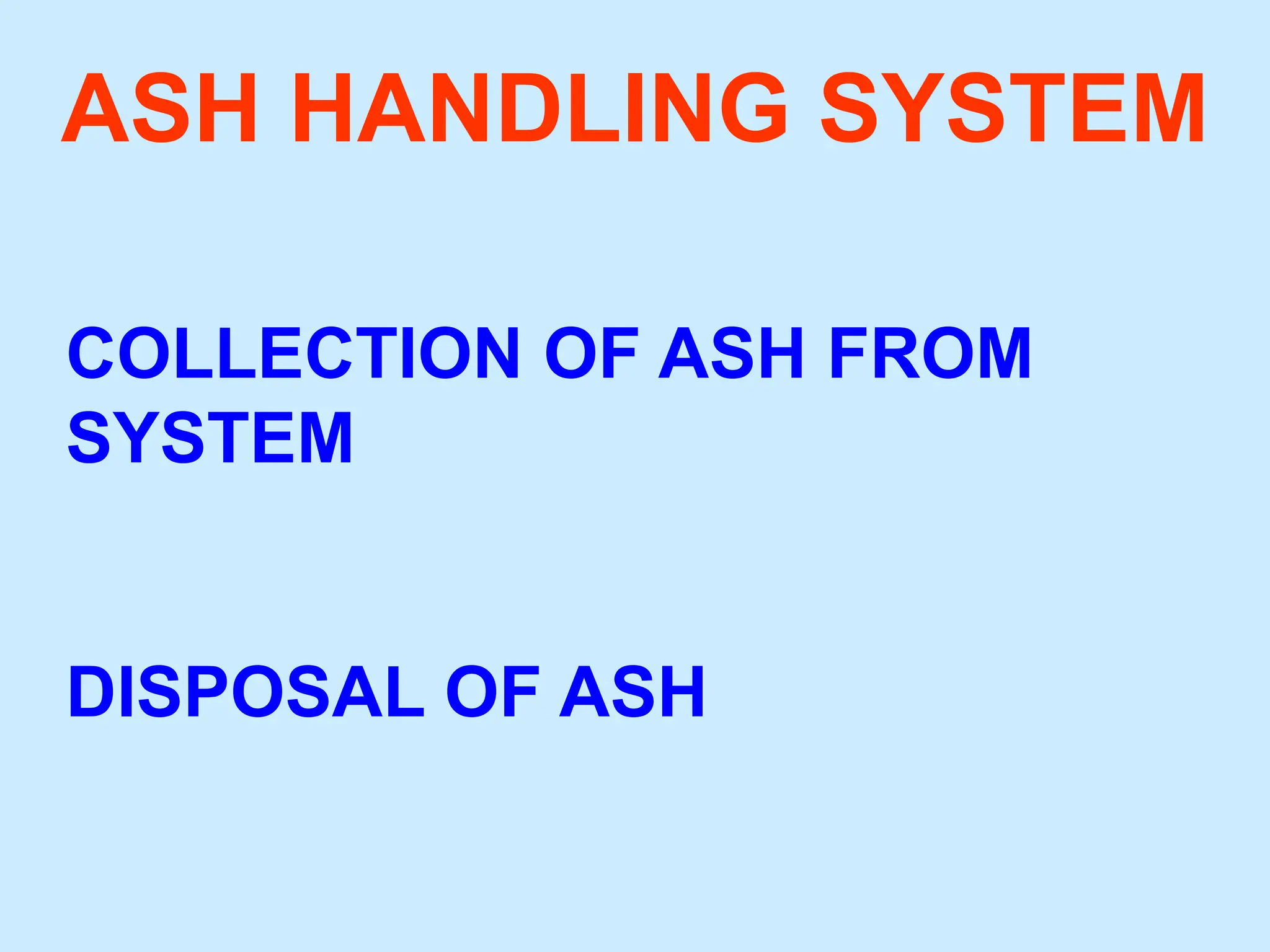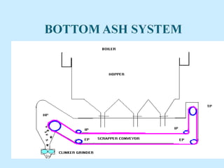 The document describes the ash handling system of a power plant. It collects ash through bottom ash, fly ash, and wet ash systems. Ash is then transported through slurry pipelines and disposed of. The system includes wetting heads, collectors, pumps, and silos for storage. Challenges include equipment corrosion, vacuum leaks, and limited ash utilization.