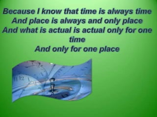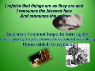 The poem expresses feelings of loss of power and ability as one ages. The speaker no longer has the hope or ability to experience life's pleasures as they once did in their youth. They pray to forget these thoughts and to accept what cannot be changed. They ask to be taught how to find peace and meaning even while growing older and weaker, and call out for spiritual comfort through change.
