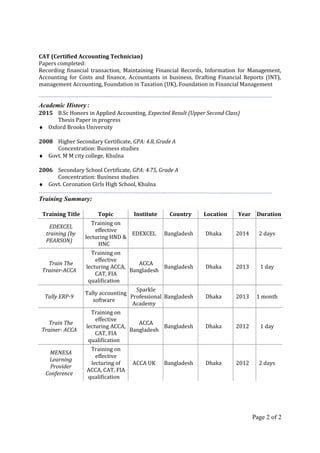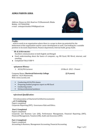 This document contains a profile, skills and achievements, employment history, professional and academic qualifications, and personal details of Asma Parvin Asha. She is seeking a position in accounts, finance, internal or group audit where she can develop her potential and career. She has over 2 years of experience as an ACCA/FIA lecturer and is pursuing her ACCA qualifications. She has completed BSc in Applied Accounting and obtained high scores in her secondary and higher secondary examinations. Her skills include strong communication in English and Bengali, proficiency in MS Office programs, and completion of TALLY ERP-9 certification.