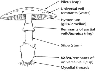 This document provides an overview of mushroom identification. It discusses the key characteristics used to identify mushrooms, including shape, features under the cap like gills or pores, color and features of the stem. Specific mushrooms that can be found in different seasons are highlighted, including morels in spring, chanterelles and boletes in summer, and hen of the woods and puffballs in fall. Methods for identification like spore prints and examining remnants of veils are explained. Hazards of mushroom poisoning from certain toxic species like destroying angels are also covered. The document aims to educate people on the basics of mushroom foraging and identification.