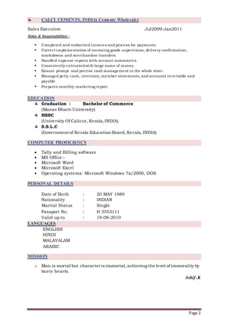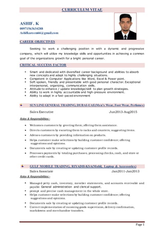 This document is a curriculum vitae for Ashif K. It summarizes his work experience, education, skills, and personal details. Ashif has over 6 years of experience in sales roles in the men's wear, footwear, and cement industries in Dubai, Riyadh, and India. He has a Bachelor's degree in Commerce and is proficient in computer programs like MS Office, Tally, and billing software. His skills include customer service, sales, inventory management, and financial reporting. He is seeking a new challenging position that allows him to utilize his knowledge and skills.