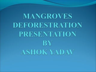 This document discusses mangrove ecosystems, including their distribution, habitat characteristics, and importance. Mangroves are found between 32°N and 38°S, with the largest areas in Indonesia, Nigeria, Australia and Mexico. They are adapted to survive in saline, muddy soils and anoxic conditions. Mangroves protect coastlines, serve as nurseries for fisheries, and support diverse marine and terrestrial wildlife. Common mangrove plants belong to the Rhizophora and Avicennia genera. Mangrove forests are ecologically important and provide resources to coastal communities.