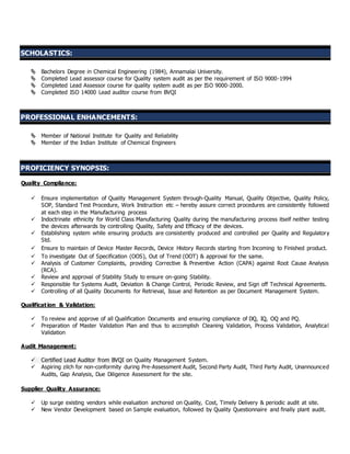 This document is a resume for Raghavan Nair Asok Kumar, highlighting his 30 years of experience in quality assurance and regulatory affairs for medical devices and healthcare. It summarizes his roles and responsibilities at Johnson & Johnson Medical India Limited since 2013 as Vice President of Quality Assurance and Regulatory Affairs, and previous roles at Covidien Healthcare India from 2009 to 2013 as Director of QA for Asia and Head of QA/RA for the Indian subcontinent. It also lists his skills, qualifications, and achievements in establishing quality management systems and obtaining regulatory approvals.