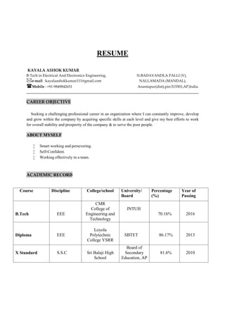 Kayala Ashok Kumar is seeking a challenging career where he can improve and develop his skills. He has a B.Tech in Electrical and Electronics Engineering from CMR College of Engineering and Technology with 70.16% and a diploma in EEE from Loyola Polytechnic College with 86.17%. He has 6 months of work experience in the electrical department at MGM Springs Pvt. Ltd. and one month of training in a transformer industry. His technical skills include MATLAB, Simulink, PLC programming, and PCB designing. He has participated in various extracurricular activities like cricket, workshops, and blood donation camps.