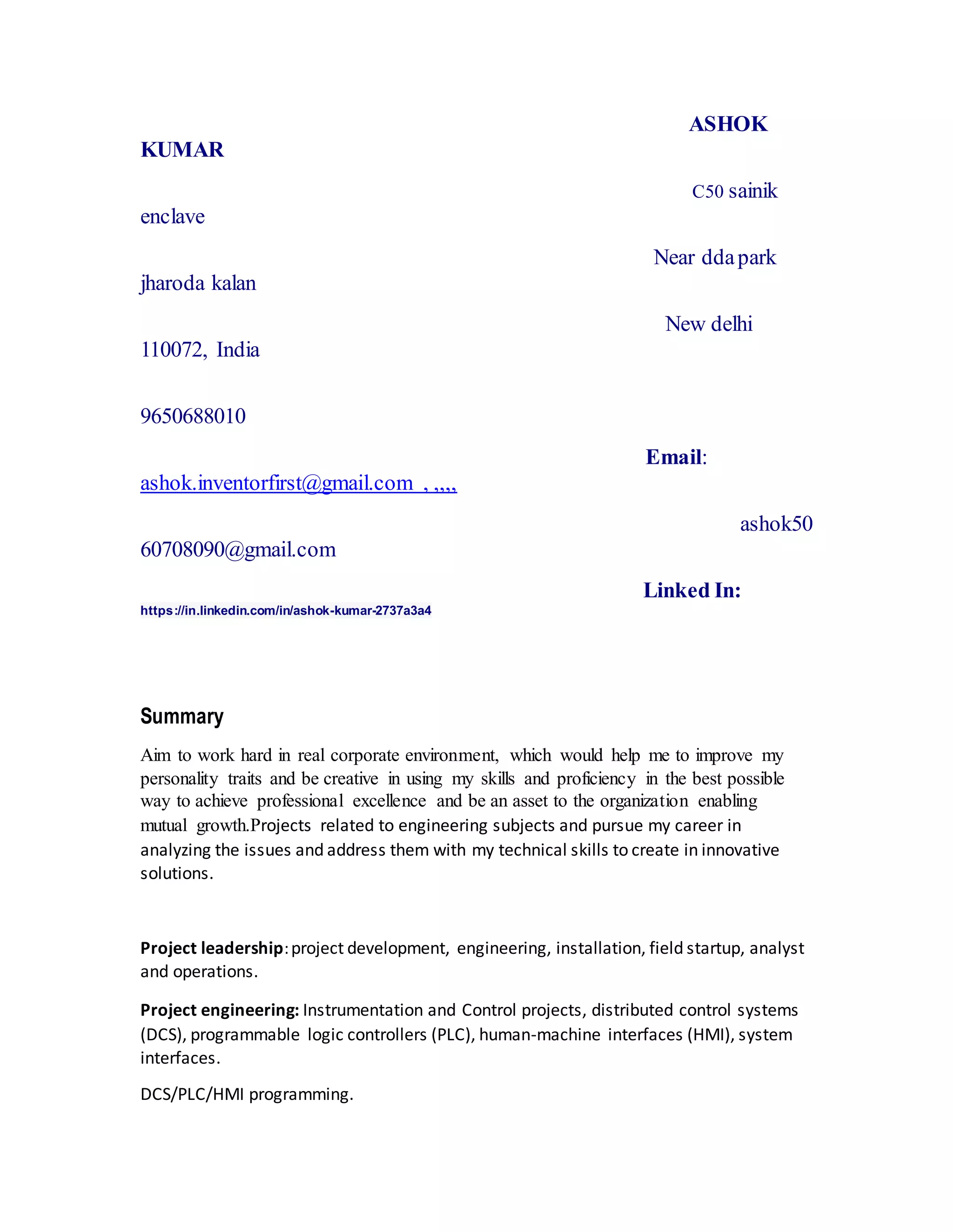 This document contains a summary of Ashok Kumar's qualifications and experience. It includes his contact information, educational background which includes a diploma in instrumentation and control engineering and a B.Tech in the same field. It also outlines his work experience which includes internships in industrial training and a technology internship at a US law firm in India. His skills and qualifications include expertise in instrumentation, DCS/PLC programming, project engineering and management.