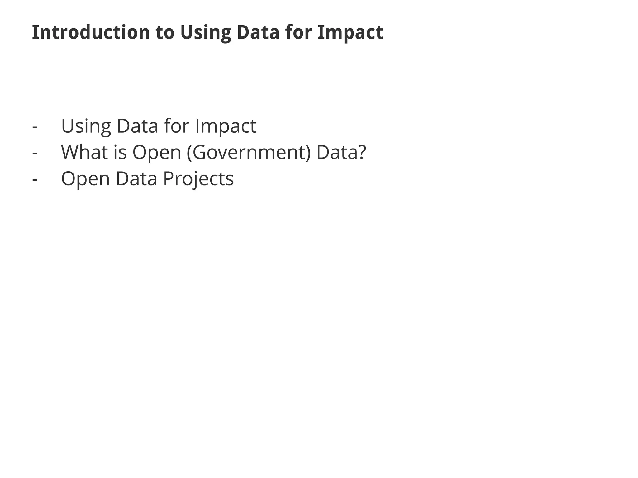 The document outlines a session on using data for impact, detailing its structure, topics, and the significance of open government data. It emphasizes essential characteristics of open data, such as accessibility, interoperability, and non-discriminatory access, while also highlighting various open data projects. The session aims to educate participants on the methods and tools for leveraging data to drive social change and informed decision-making.