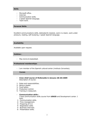 Ashraf Mohammad ghanem is seeking an academic position where he can develop his skills and experience. He holds a B.A. in accounting from Al- Al bayat university with a grade of 76.5%. Currently he works as a senior accountant at Aramex in Amman, Jordan. He is fluent in Arabic, English, and Spanish and has excellent communication and teamwork skills. His hobbies include playing tennis and basketball and he is a member of the Spanish cultural center. He has taken courses in crew chief management, communication skills, time management, resume preparation, negotiation skills, business interviews, and presentations.