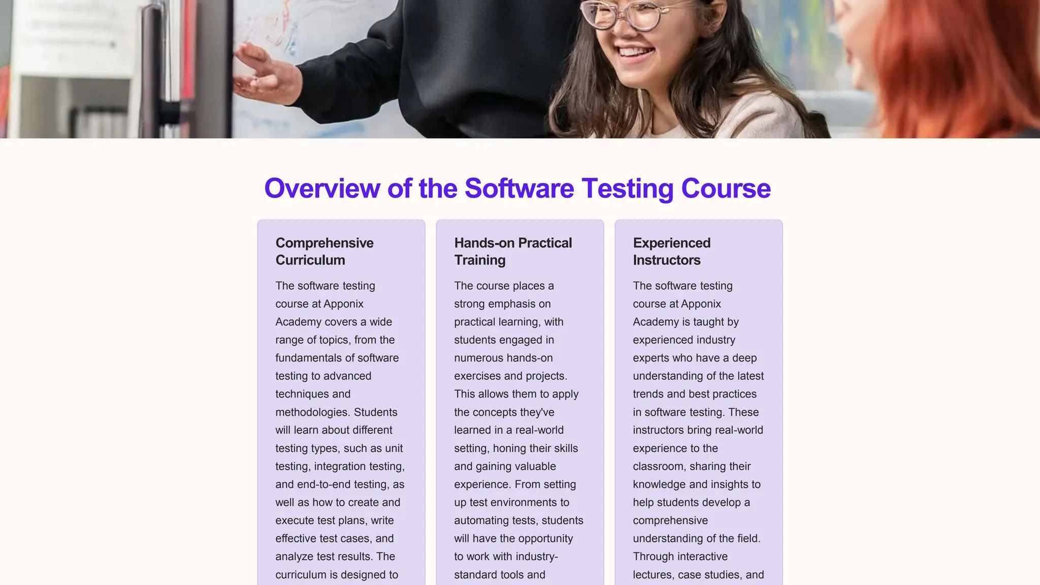 Apponix Academy offers a comprehensive software testing course designed to equip students with essential skills for careers in software development. The curriculum covers fundamental to advanced topics in software testing, emphasizing hands-on practical training and real-world applications. Upon completion, students receive industry-recognized certification, enhancing their career opportunities in a rapidly growing field.