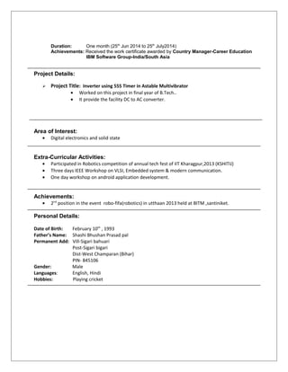 Ashutosh Kumar is seeking an entry level position in software development or electronics. He has a B.Tech in Electronics and Communication Engineering with over 70% marks. His technical skills include Windows, MS Office, C, Java, PHP, and MySQL. He has work experience with IBM on an embedded software project for vehicle tracking and completed projects on DC to AC conversion and robotics competitions.