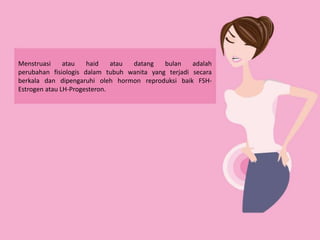 Dokumen tersebut membahas mengenai menstruasi, tanda dan gejalanya, serta fase-fase terjadinya menstruasi pada wanita. Juga dibahas mengenai air susu ibu, kandungan gizinya, dan faktor-faktor yang mempengaruhi produksi ASI.
