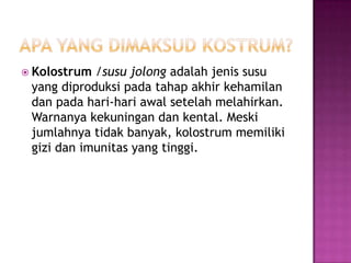 Dokumen ini menjelaskan tentang kolostrum dan ASI eksklusif, manfaatnya bagi bayi dan ibu, serta cara menyusui yang benar. Kolostrum adalah susu awal yang kaya gizi dan imun, sementara ASI eksklusif adalah pemberian ASI tanpa makanan lain hingga bayi berumur 6 bulan. Manfaatnya mencakup peningkatan kesehatan bayi, pengurangan risiko kanker bagi ibu, dan aspek ekonomi serta psikologis untuk keluarga.