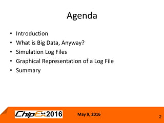 The document discusses how big data tools can be used to simplify debugging by extracting data from large simulation log files and presenting it graphically. Specifically, it proposes indexing simulation log files using Lucene to enable fast searching and extraction of relevant records. This would allow engineers to quickly find error messages and events within log files that can reach several gigabytes in size. Graphical representation of the log file data is presented as a more intuitive way to analyze logs and trace problems compared to navigating raw text. The goal is to harness big data techniques to shorten debugging time and increase productivity for verifying complex chip designs.