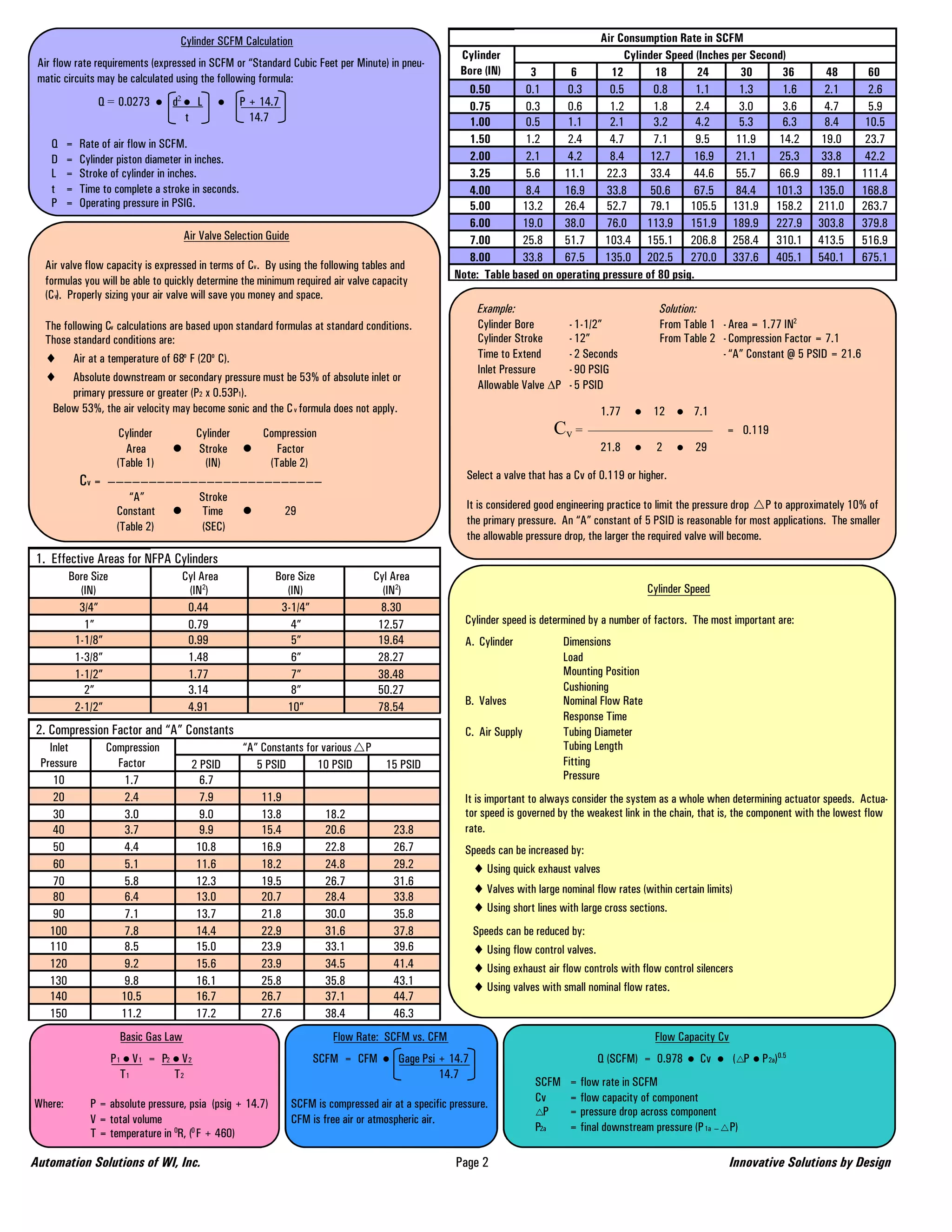 This document provides technical information for selecting and sizing cylinders, vacuum cups, valves, and other pneumatic components. It includes tables for determining cylinder force output based on piston size and pressure, formulas for calculating air flow requirements, and guidelines for selecting vacuum cup size and air valves based on flow needs. Conversion tables are also included for common units like pressure, volume, temperature and more.