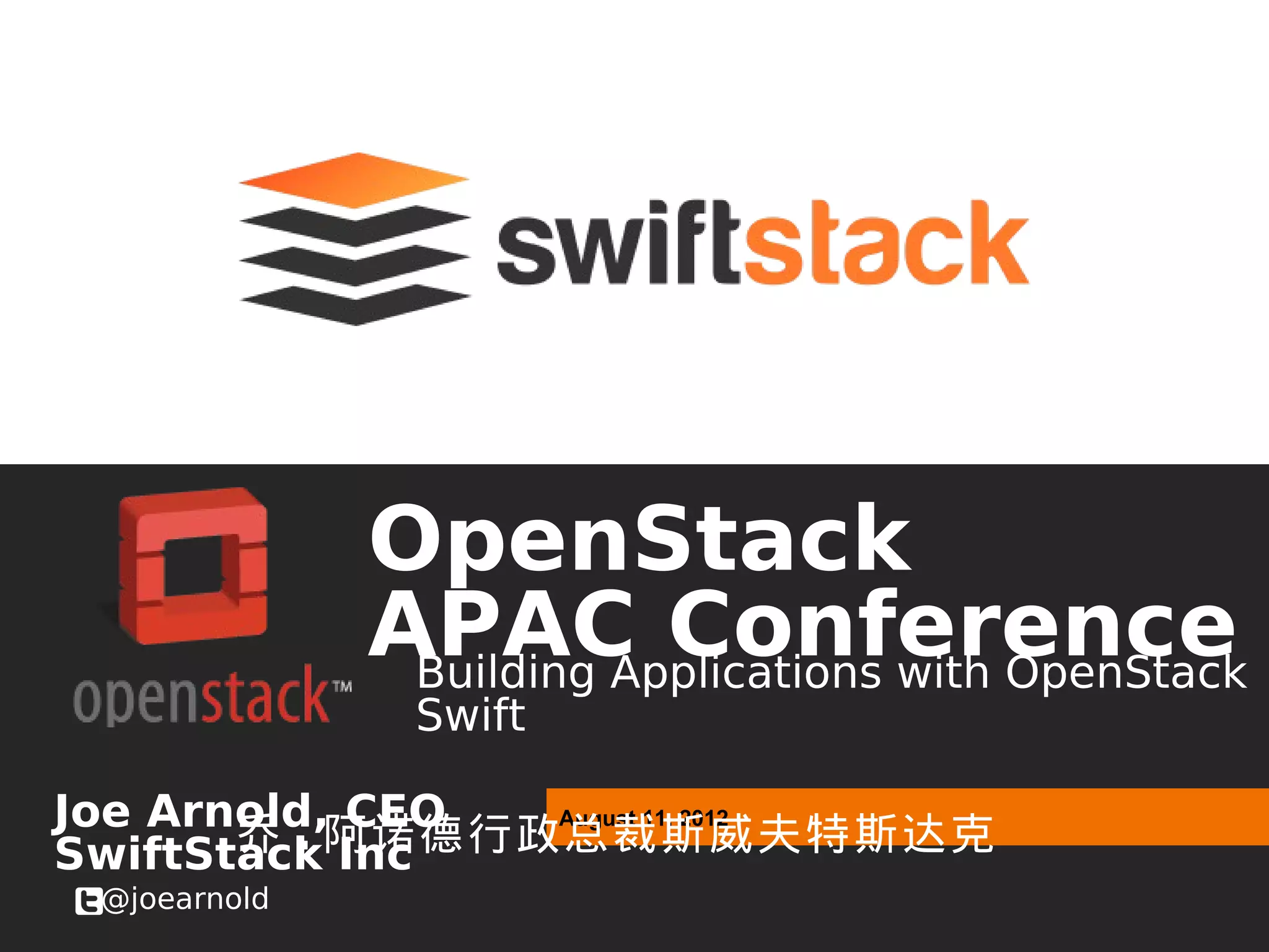 This document summarizes a presentation by Joe Arnold, CEO of SwiftStack Inc., about building applications with OpenStack Swift. The presentation discusses how Swift is well-suited for web and mobile applications due to its HTTP interface and ability to scale to support massive numbers of users. It also notes that Swift enables infrastructure as a service by providing multi-tenancy, scaling out capacity efficiently, and improving operational efficiencies.