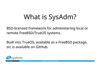 SysAdm is a BSD-licensed framework for administering FreeBSD/TrueOS systems locally or remotely. It includes a server that runs on managed systems and provides an API, a client with graphical utilities, and an experimental bridge. The server uses JSON over REST or WebSockets and requires authentication. The client accesses server APIs and provides notifications. The bridge allows connections to systems behind firewalls.
