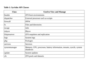 SysAdm is a BSD-licensed framework for administering FreeBSD/TrueOS systems locally or remotely. It includes a server that runs on managed systems and provides an API, a client with graphical utilities, and an experimental bridge. The server uses JSON over REST or WebSockets and requires authentication. The client accesses server APIs and provides notifications. The bridge allows connections to systems behind firewalls.