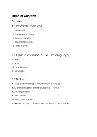 The document is a case study on the S11 House in Petaling Jaya, Malaysia. It investigates how local climatic responsive materials were used in the house to respond to the local climate of being hot and humid. The key materials discussed include timber, steel, concrete, brick, marble and low-e glass. For each material, the document discusses the type used in S11 House, its properties, and how it climatically responds to the hot and humid conditions in Petaling Jaya through providing thermal comfort, resisting deterioration, and achieving sustainability. The overall goal of the case study is to demonstrate how the appropriate selection and application of materials can help buildings adapt to their local climate conditions.