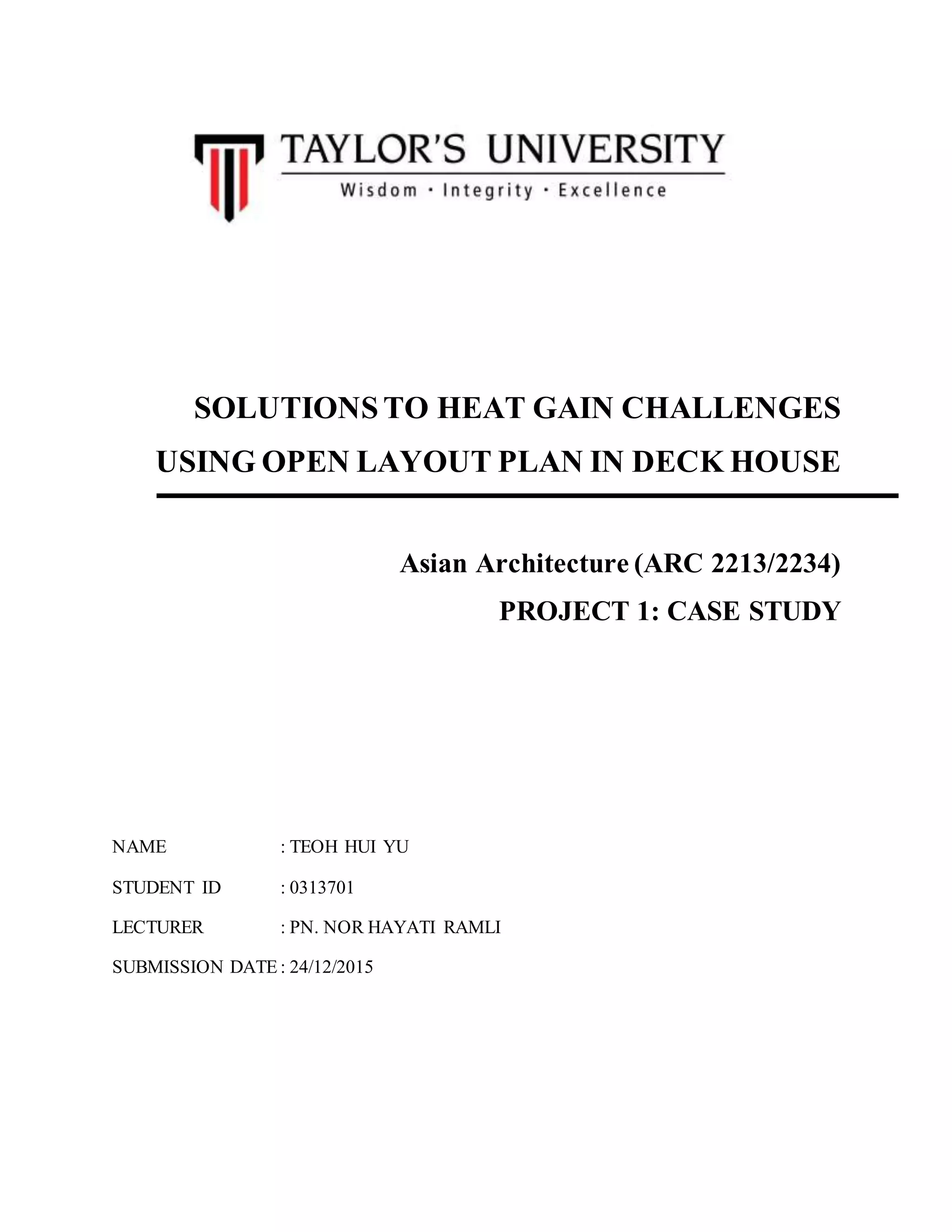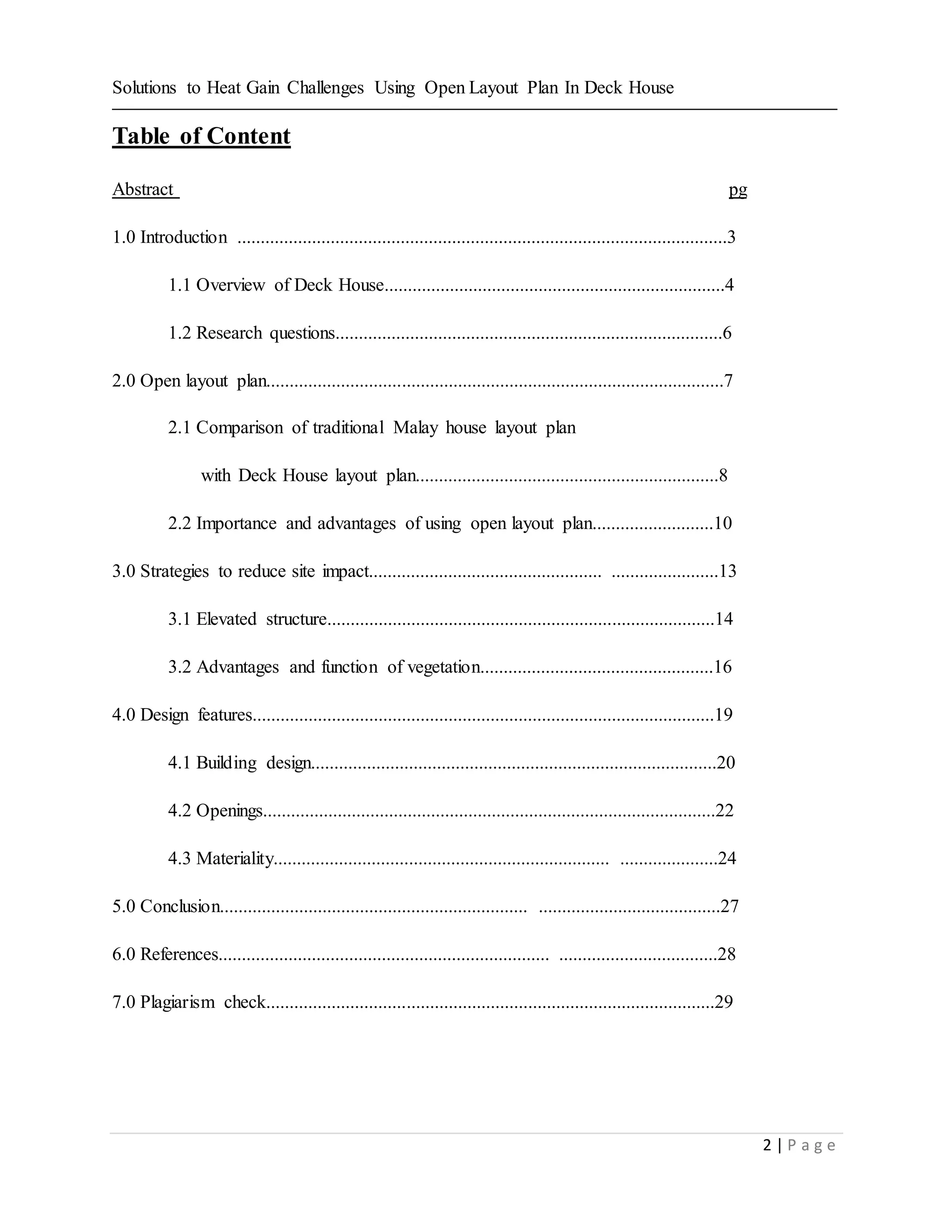 The document discusses solutions to heat gain challenges in Deck House through the use of an open layout plan. It begins by providing an overview of Deck House and traditional Malay house design, noting their use of open layout plans. It then compares the traditional and Deck House layout plans, finding that both utilize minimal interior walls and connected spaces to allow cross ventilation. The document aims to investigate how the open layout plan is effective in reducing heat gain and discusses other design strategies, features, and materials used in Deck House to further address the tropical climate challenges.