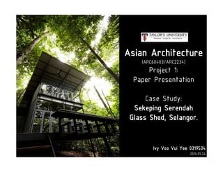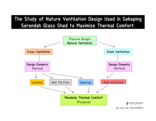 This document presents a case study on the Sekeping Serendah Glass Shed in Selangor, Malaysia. It discusses the passive design elements used to maximize thermal comfort, including natural ventilation techniques like cross ventilation and stack ventilation. Some key design elements that enhance ventilation are the building's elevated level, open wall partitions and openings, and the roof structure. Materials like steel, glass, and brick are used to allow air flow while providing shading and insulation. The design draws from principles of traditional Malay vernacular architecture and effectively combines natural ventilation with modern materials to create a thermally comfortable space.
