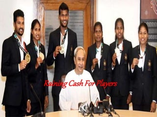 The Chief Minister of Odisha, Naveen Patnaik, awarded large cash prizes to athletes from Odisha who medaled at the 2018 Asian Games in Jakarta. Sprinter Dutee Chand received Rs. 3 crore for winning silver in the 100m and 200m races. Six Odisha hockey players who medaled with the Indian teams received Rs. 1 crore each for the women who won silver and Rs. 50 lakh each for the men who won bronze. The Chief Minister also rewarded two other athletes with Rs. 7.5 lakh each for participating. The document discusses the large monetary awards given to athletes from Odisha to honor their success at the Asian Games.
