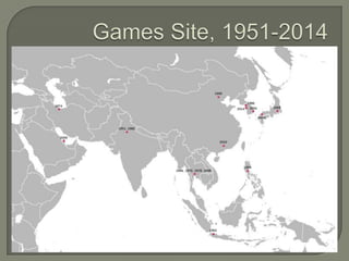 The Asian Games are a multi-sport event held every four years among athletes from Asia, regulated by the Olympic Council of Asia. The inaugural Asian Games were held in 1951 in New Delhi, India. Since then, they have been hosted by 9 different nations every four years, with the most recent edition in 2010 in Guangzhou, China. The Games aim to promote mutual understanding between Asian countries through sport rather than violence after independence.